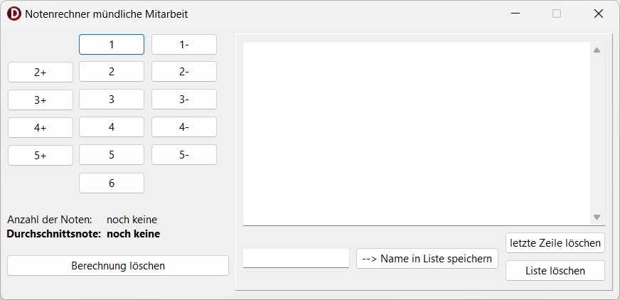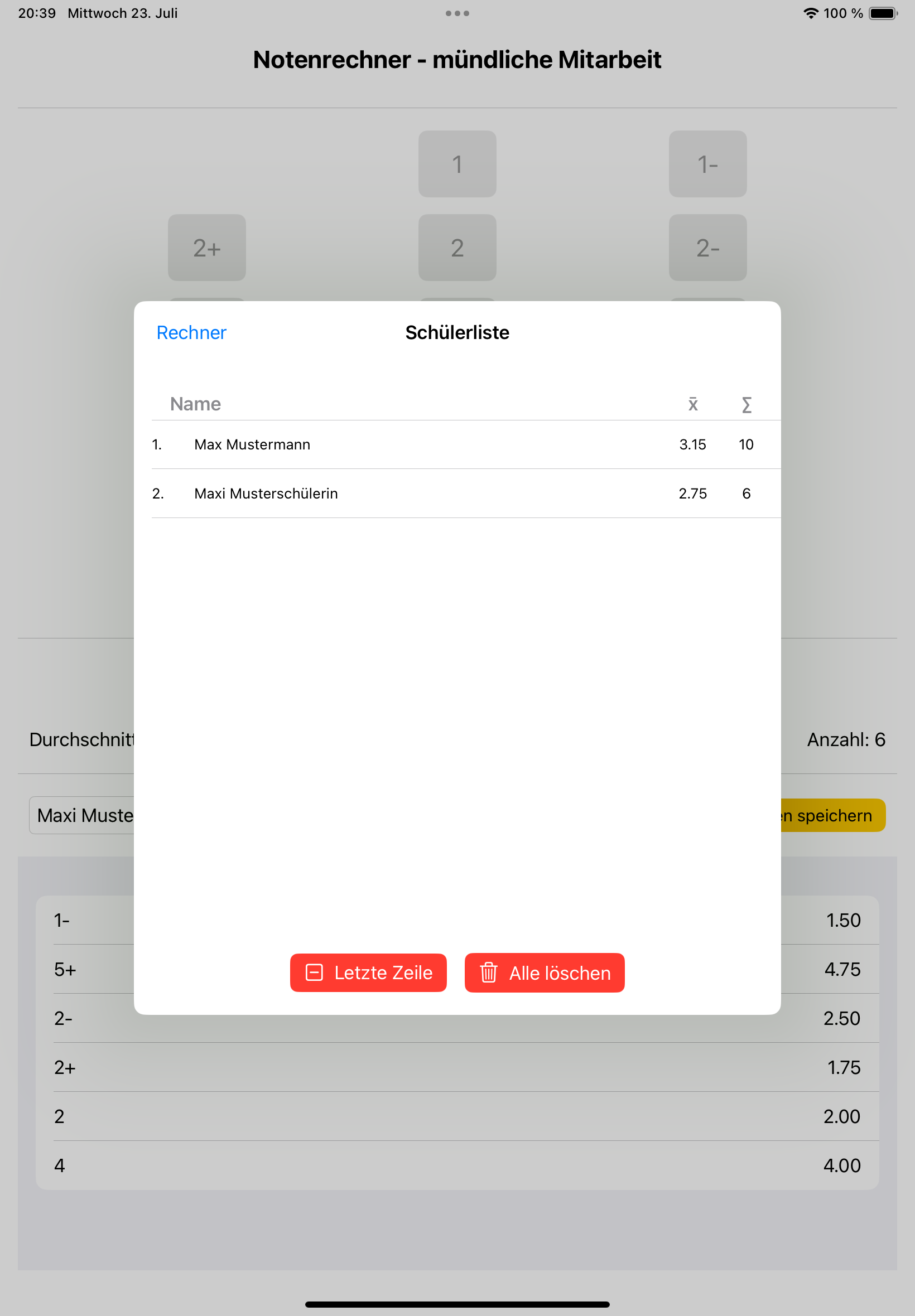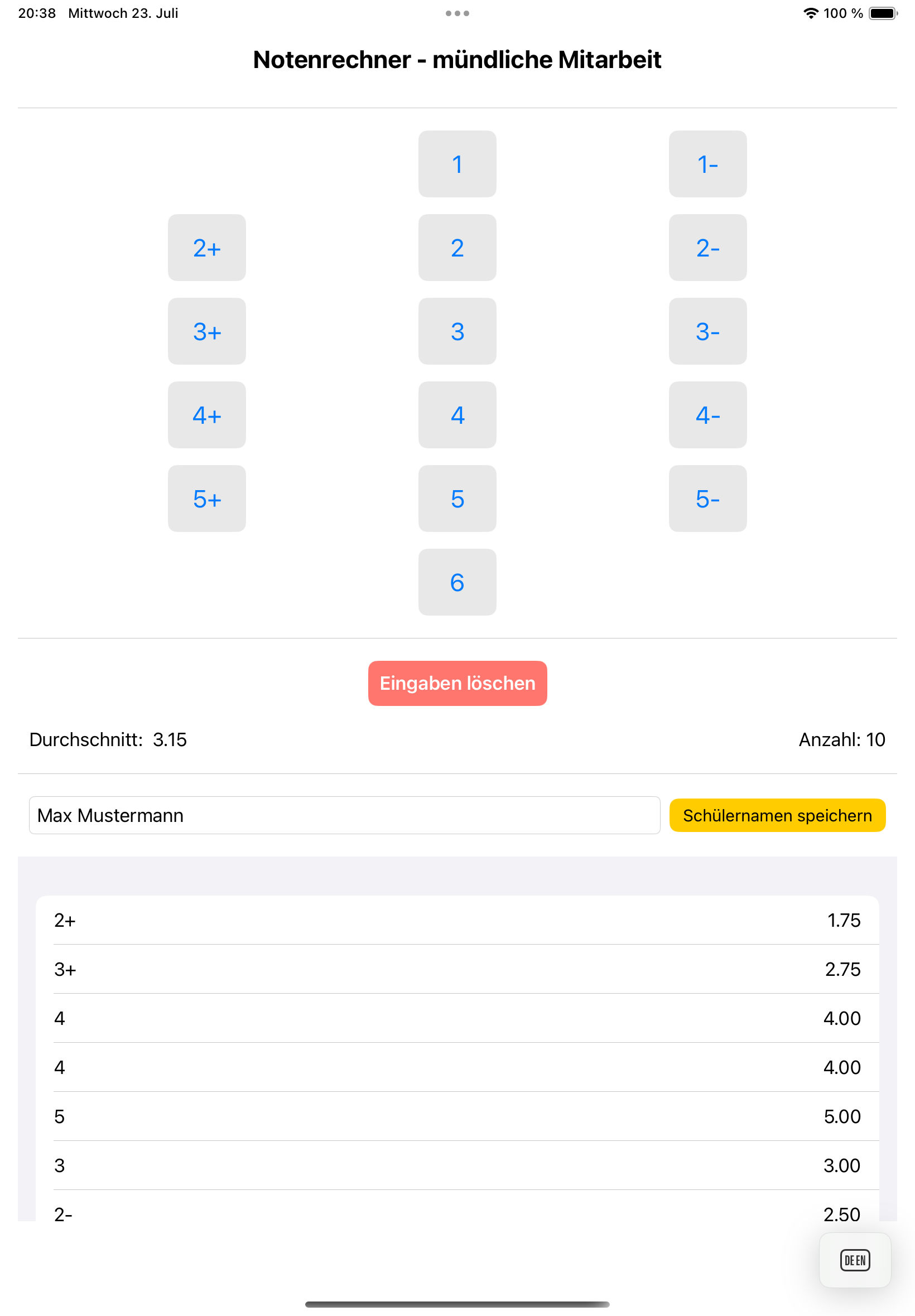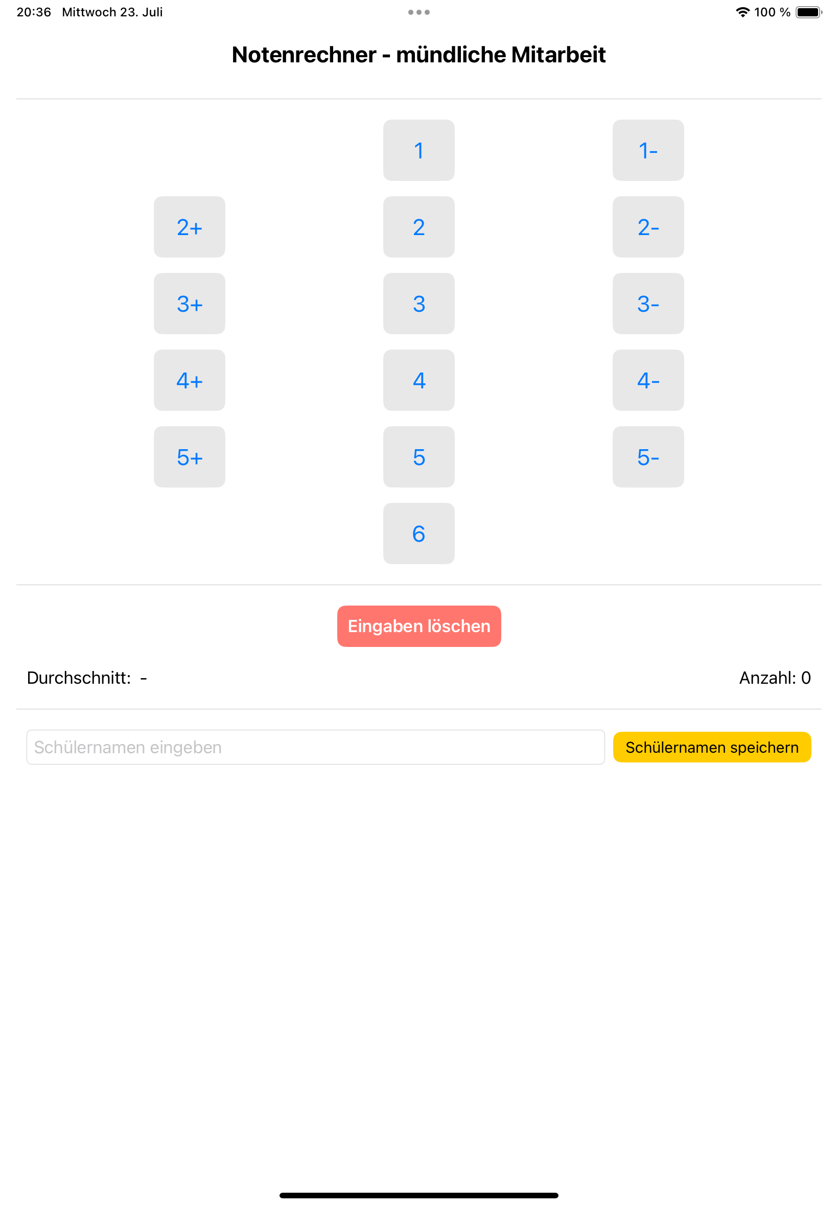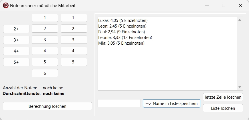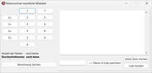 Wer kennt es nicht? Die nächste Zeugniskonferenz oder der nächste Elternsprechtag naht und man hat sich für seine Schülerinnen und Schüler ausschließlich handschriftliche Notizen gemacht. Diese App erlaubt es, viele einzelne Noten ganz einfach zusammenzurechnen. Anstatt mit Kommazahlen wie 0,5 und 0,75 mühsam rechnen zu müssen, klickt man die entsprechende Note einfach nur an.