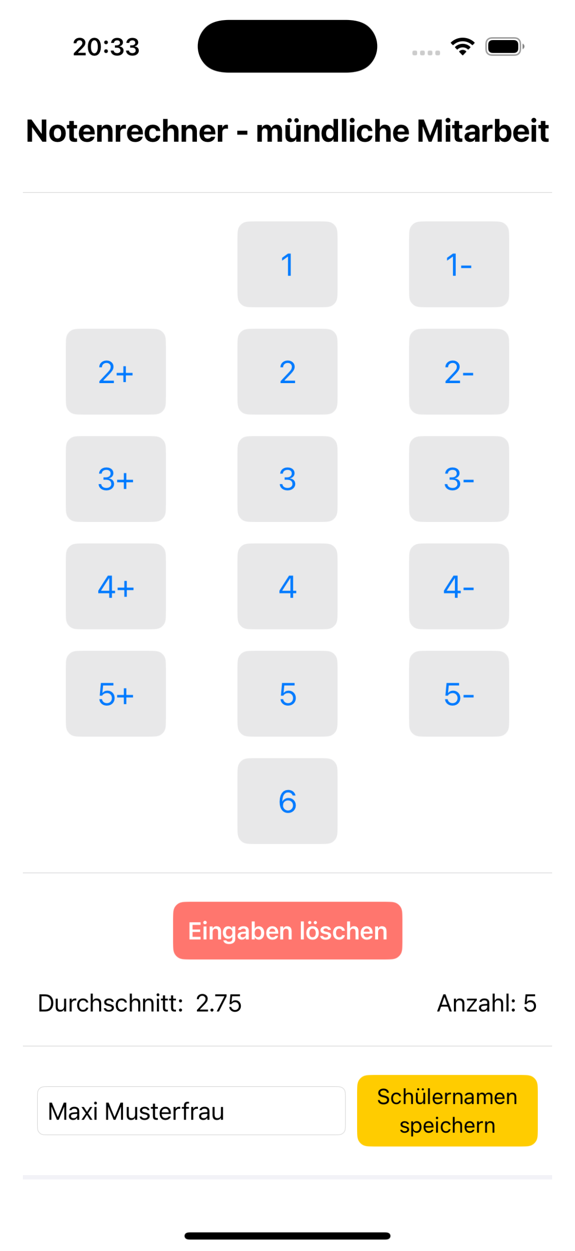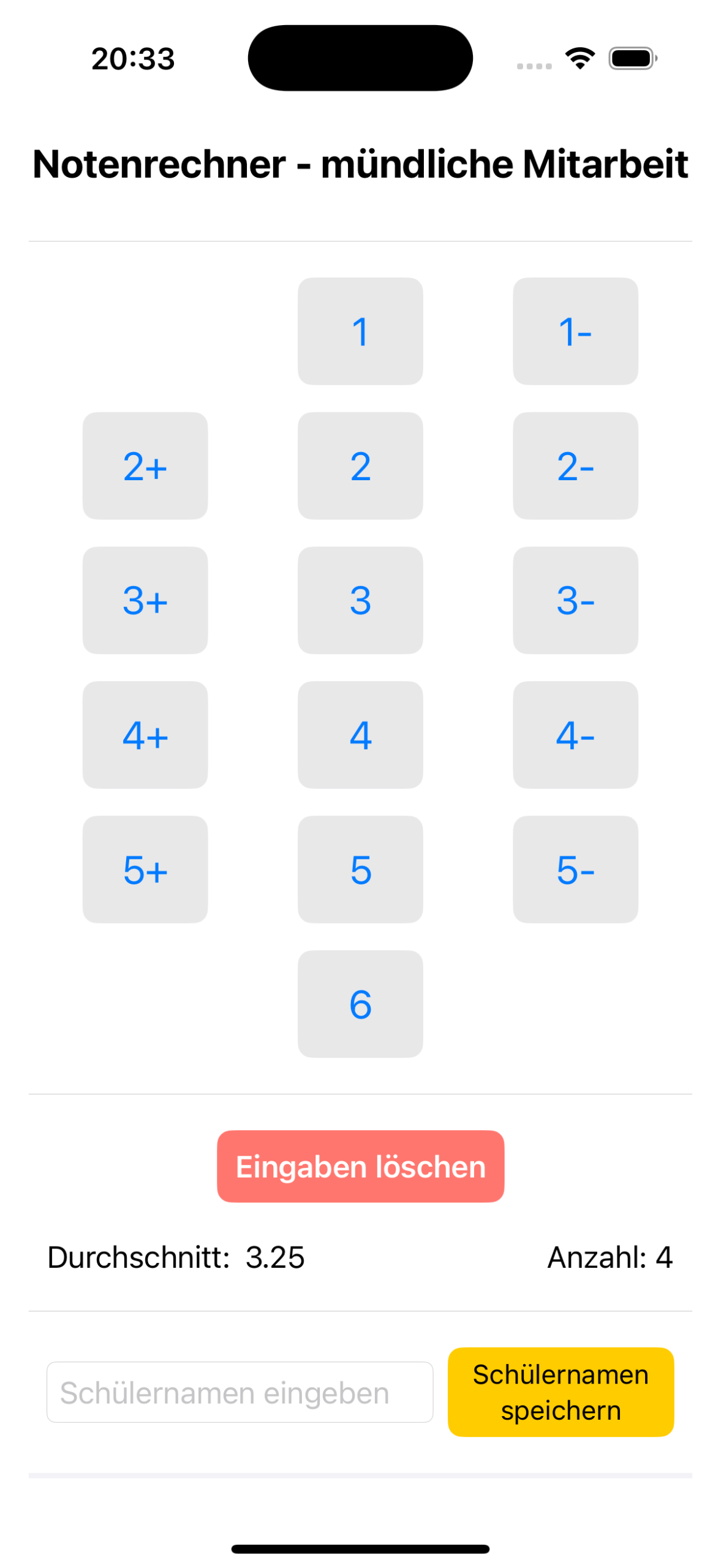 - Sofortige Anzeige von Durchschnitt und Anzahl aller erfassten Noten