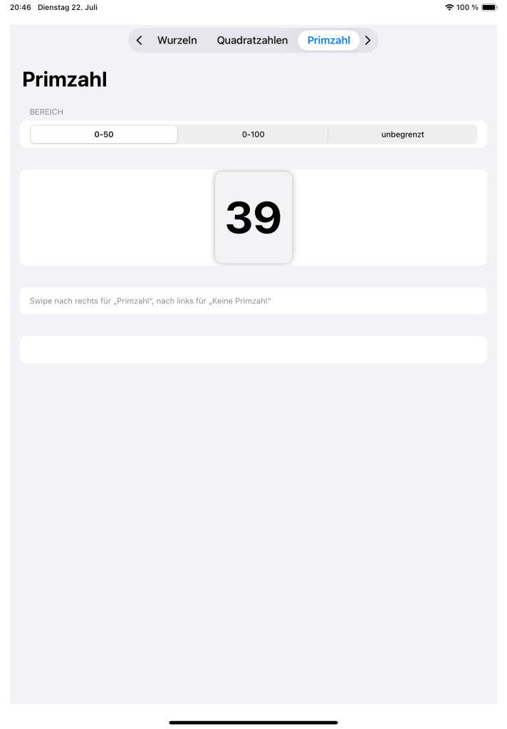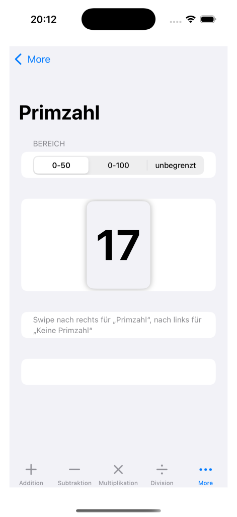 - Primzahl-Check per Swipe: rechts = Primzahl, links = keine